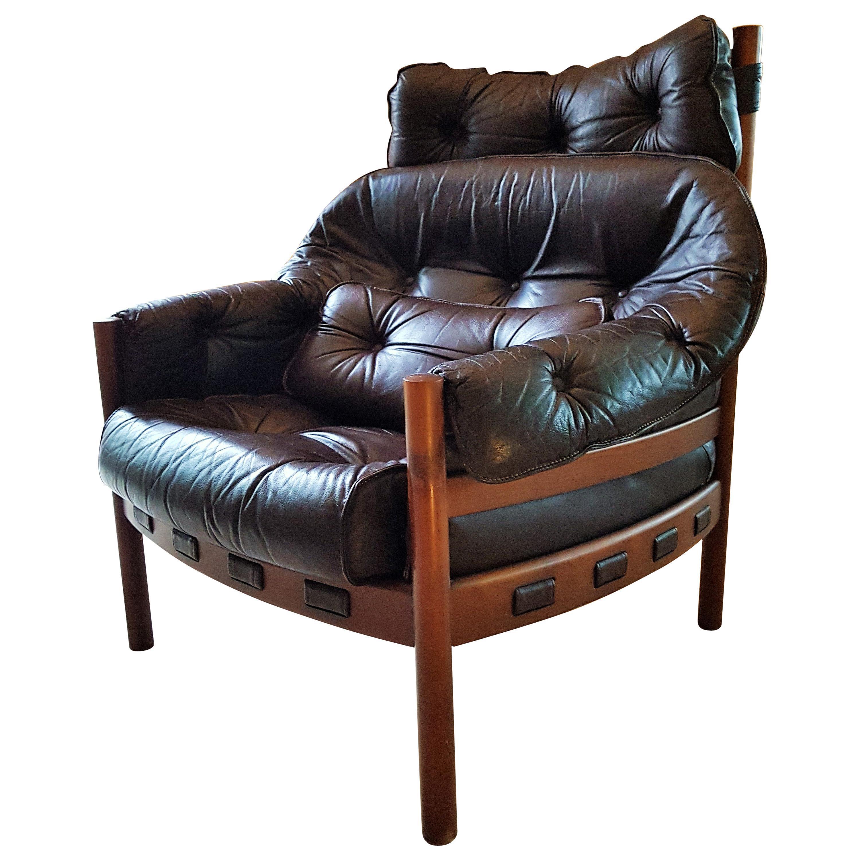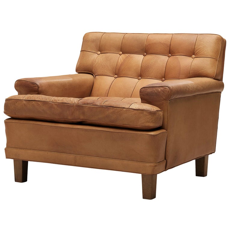 Exceptional vintage leather ari lounge chair designed by arne norell from sweden.