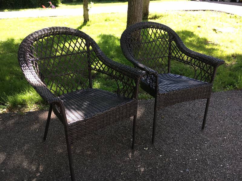 Beautiful (looking), classy, brown wicker patio lounge that i bought at lowes. Stacking chairs are easily stored or moved. (i bought two of the same chair and the same thing happened with each.)