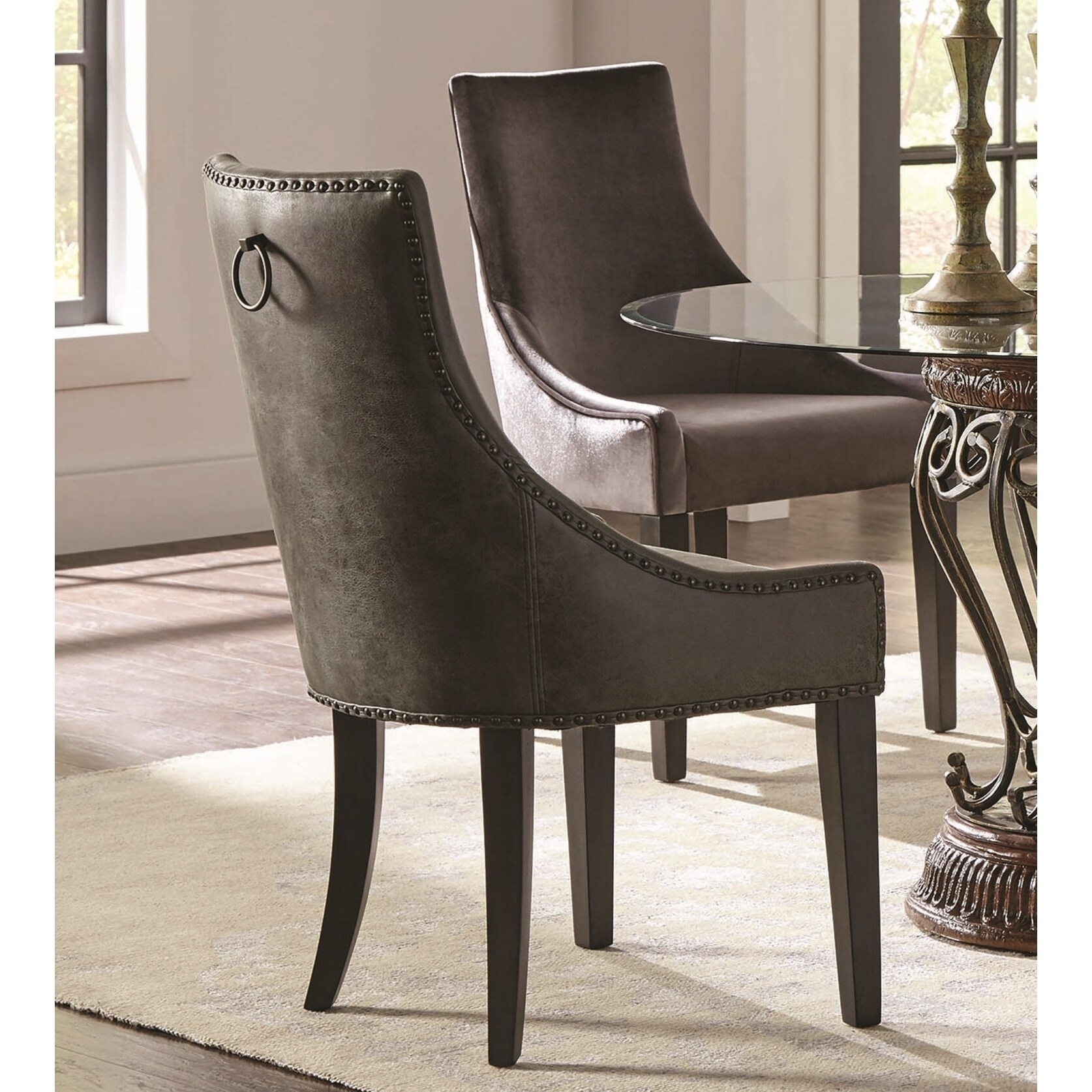 Silver roll top dining chair with ring pull.